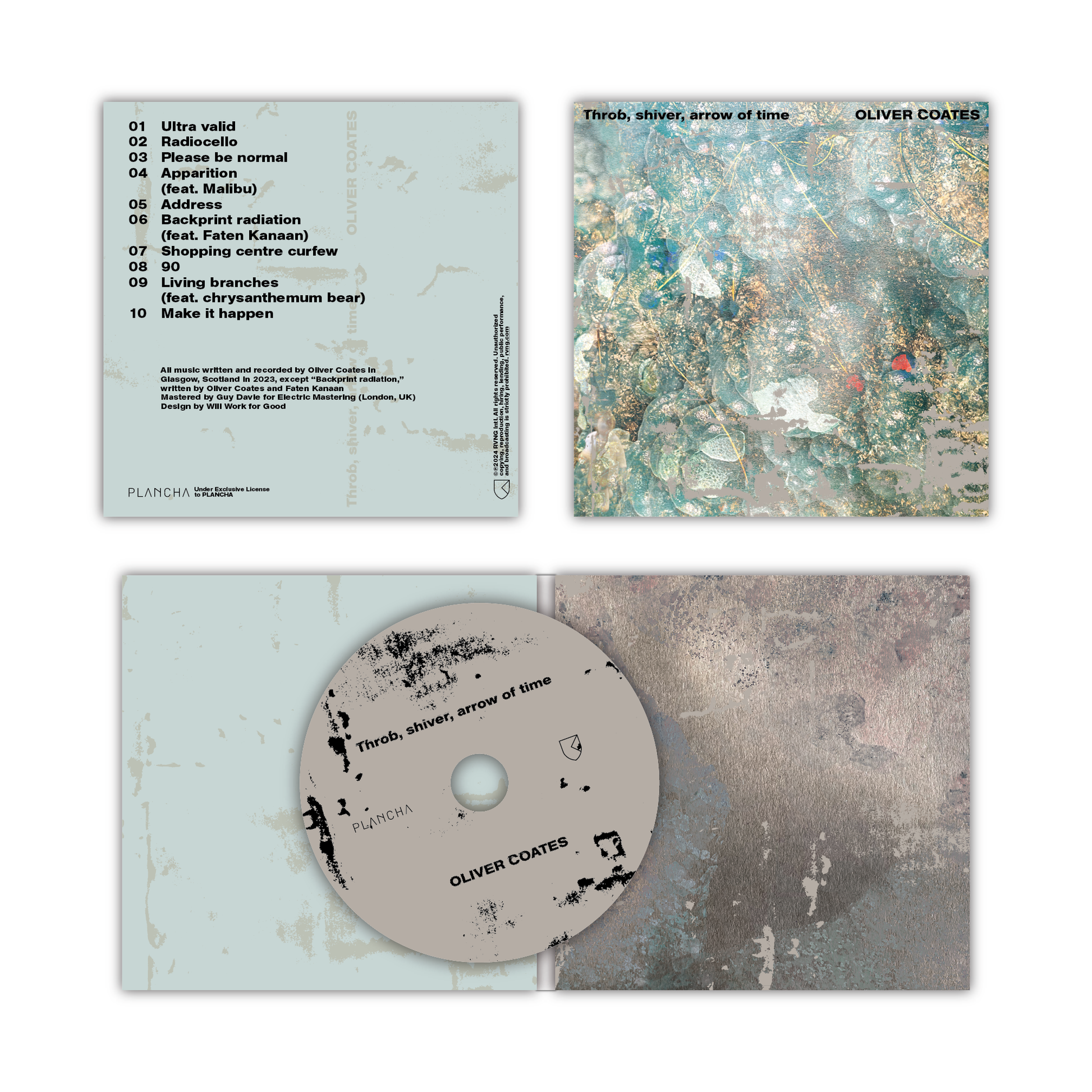 While working on Aftersun, Wells asked Coates how music could signal that someone is going on a trawl through their memory—a question that has stayed with him ever since and fosters a heartbeat running through the record. Throb, shiver, arrow of time is “all about inaccurate transmissions from our memories, overlaid with emotions from other sources,” says Coates. The release is imbued with the ache and glow of recollections mulched together, where the guttural dissonance of misremembering is shrouded by strange orbs of sentiment.