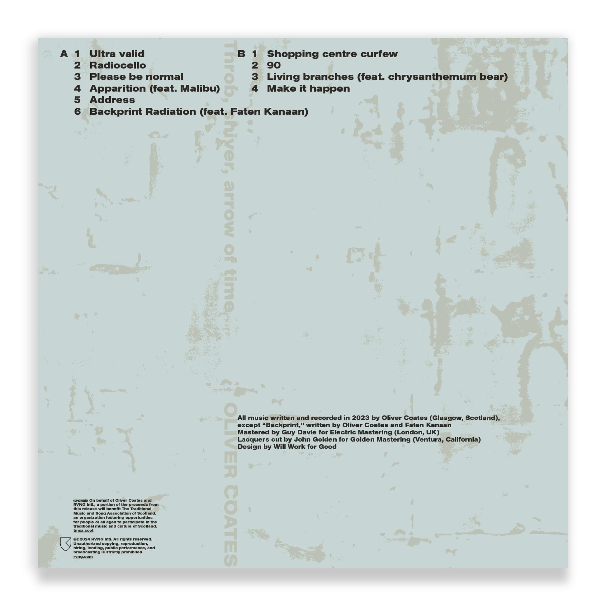Oliver Coates’ Throb, shiver, arrow of time will be released on vinyl, Japanese import CD, and digital editions on October 18, 2024. On behalf of Oliver and RVNG Intl., a portion of the proceeds from this release will benefit The Traditional Music and Song Association of Scotland, an organization fostering opportunities for people of all ages to participate in the traditional music and culture of Scotland.