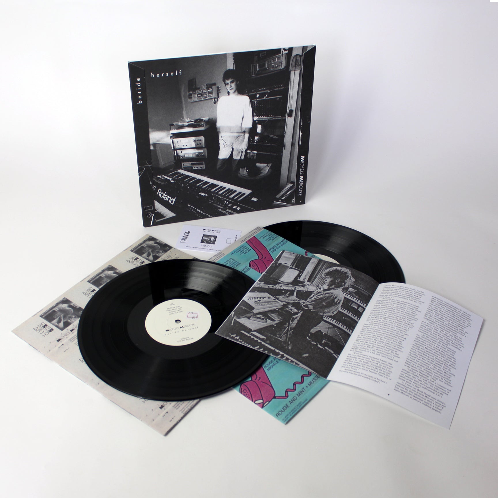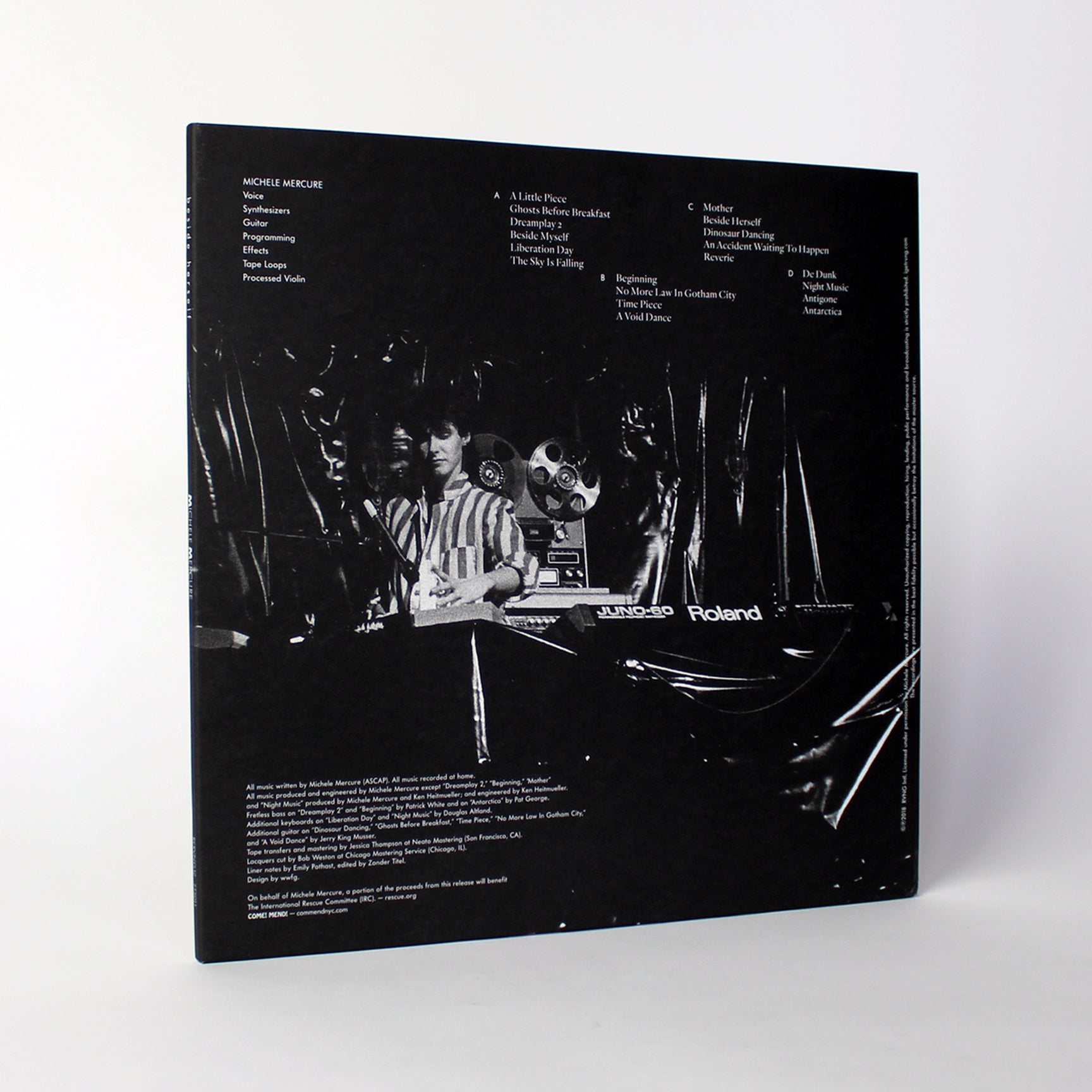 Acoustic elements such as voice and stringed instruments add a haunting lyricism to the non-tonal space unoccupied by electronic presence in Mercure’s music. The graduality of phrasing and measured sequence of tones also distinguish her music from the repetition and improvisation-heavy hallmarks of the Kosmische genre, a stylistic antecedent for the artist. Mercure’s fascination, or obsession, with new, consumer conscious music technology is demonstrated in her inventive sequencing and sampling, adding a mechanical, sometimes menacing, feel to Beside Herself.